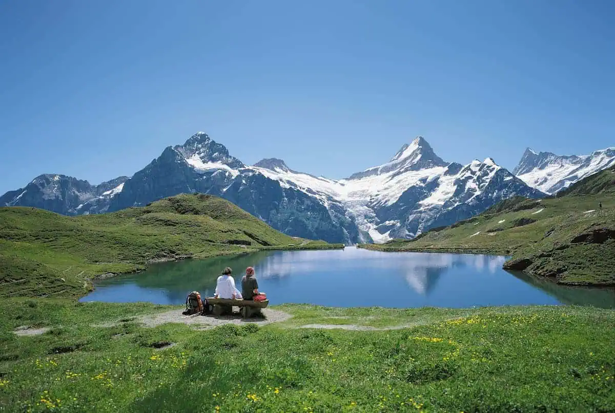 Wander through healing alpine meadows to the shores of Bachalpsee, where the raw power of the glaciers meets total mountain silence.